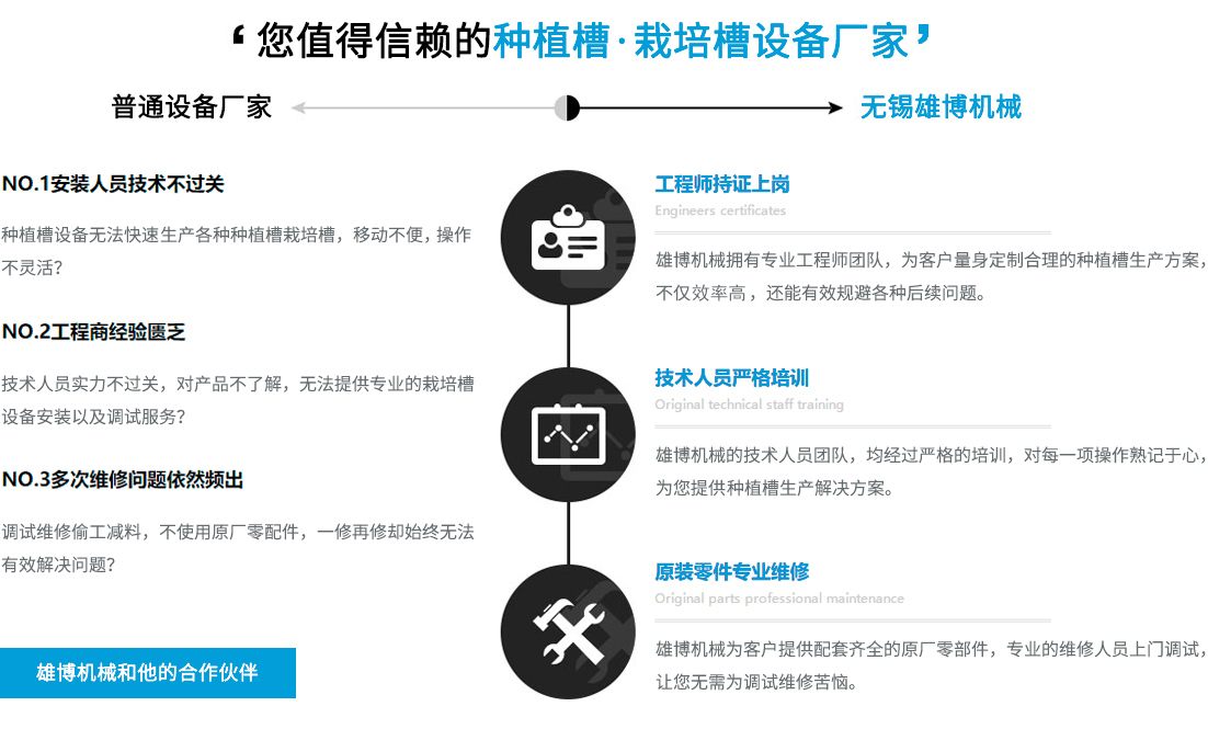 您在選擇雄博產(chǎn)品的同時(shí),也選擇無微不至的終身服務(wù)。可根據(jù)不同客戶實(shí)際需求進(jìn)行種植槽設(shè)備,栽培槽設(shè)備等的特殊工藝設(shè)計(jì)制造專業(yè)一對一售前/售后/技術(shù)咨詢指導(dǎo),享受更貼心/放心的設(shè)備使用體驗(yàn)。